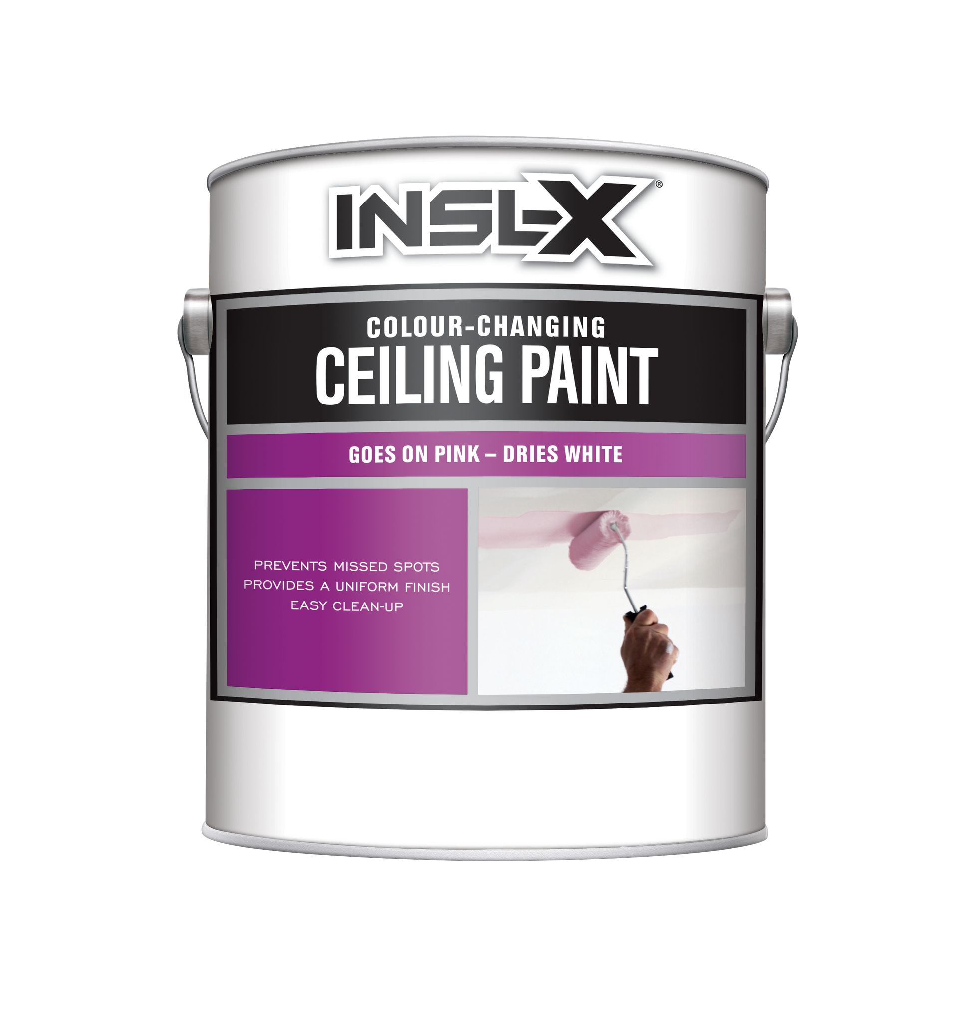 INSL-X® Colour-Changing Ceiling Paint goes on pink and dries white to help prevent missed spots and provides a uniform, flat finish.